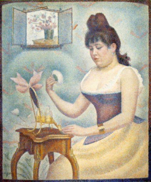 This is a portrait of Madeline Knoblock, Seurat's mistress. There is an atypical squalidness about this canvas, which could almost be seen in a gypsy wagon. Instead of the vase with flowers seen between the two panels of the folding mirror on the wall, Seurat had first painted his own portrait. When a friend who saw it told him it made him look silly, Seurat covered his face with the flower pot.